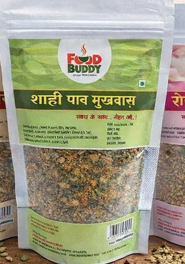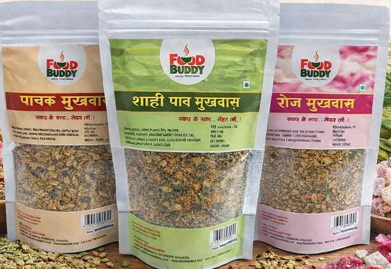 Mukhwas is a traditional Indian mouth freshener made from natural ingredients like fennel seeds, coriander seeds, sesame seeds, coconut, sugar crystals, and aromatic spices. It is commonly consumed after meals.